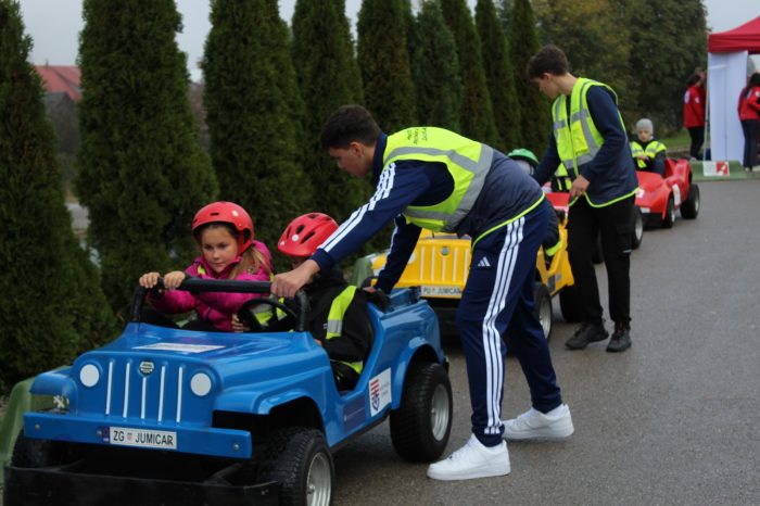 Polaznici programa dobro su se snašli na simuliranoj prometnici na kojoj su promet regulirali naši iskusni instruktori uz pomoć školske prometne jedinice iz 8. razreda: Šimun M., Lukas B., Karlo B. i Gabrijel L. na čemu smo im zaista zahvalni.