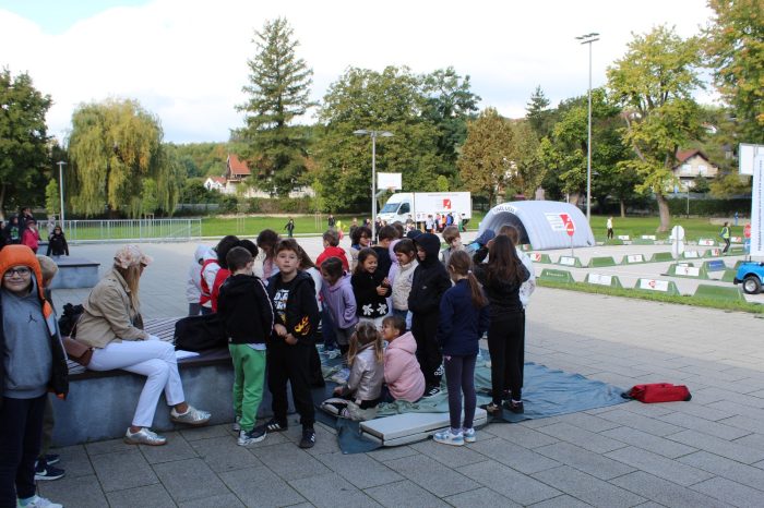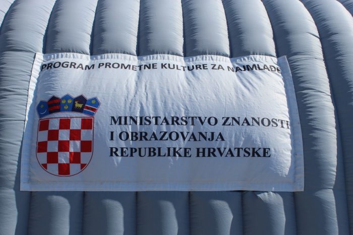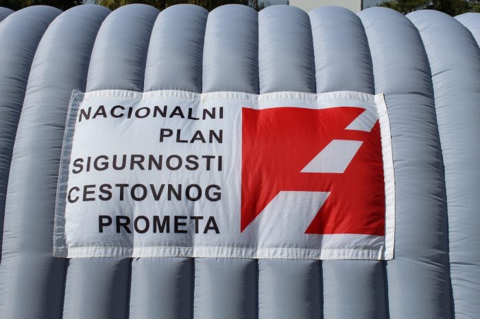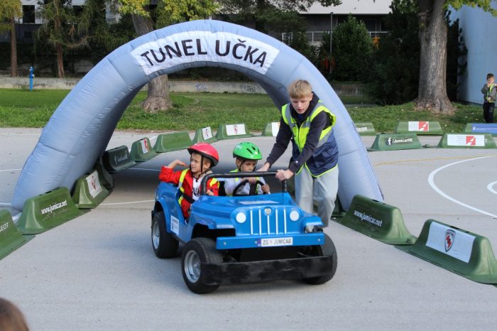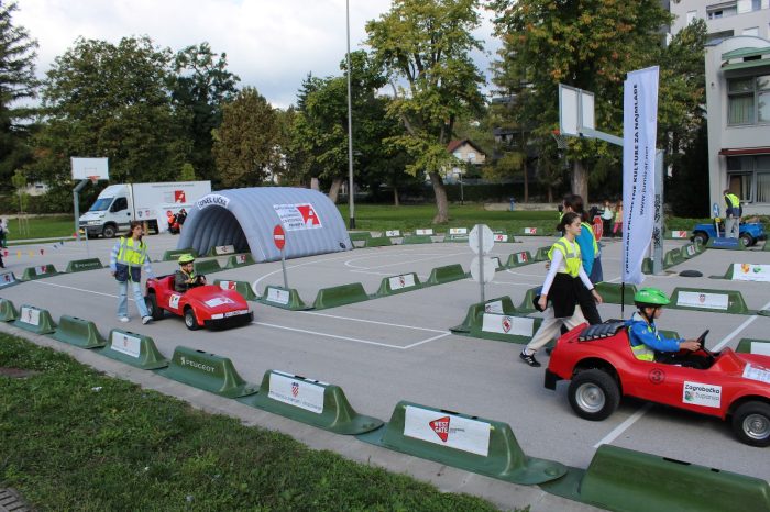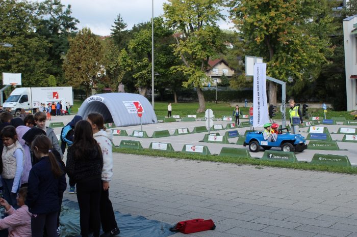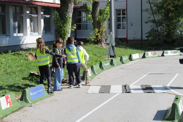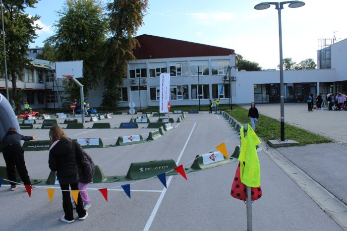 Nakon multimedijskog teorijskog dijela u trajanju od 45 minuta gdje su učenici kroz interaktivno predavanje učili o sigurnom ponašanju u cestovnom prometu, djeca su izašla na školsko igralište gdje ih je dočekao veliki mobilni prometni poligon.