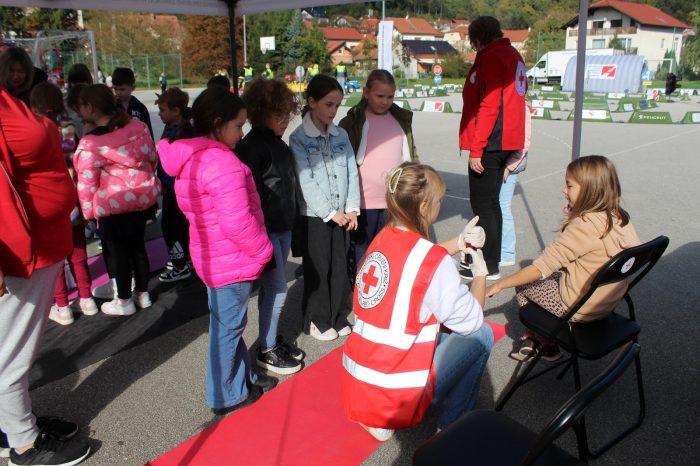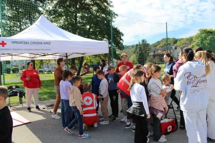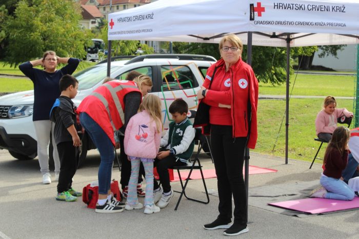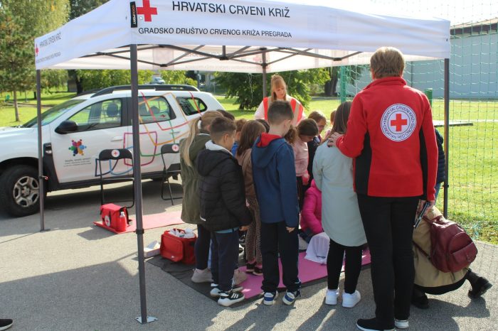 Nakon vatrogasaca, djeca su imala priliku da nauče i osnove prve pomoći u maloj školi prve pomoći koje održala osobno ravnateljica gđa Štefica Pasarić sa svojom djelatnicom gđom Gordanom Šplajt i volonterima Petra Špiljak i Martina Tušak ispred GDCK Pregrada.