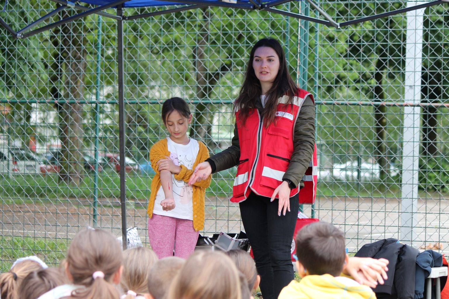 Nakon prometa, djeca su imala priliku da nauče i osnove prve pomoći u radionici GDCK Zagreb, koju je vodila volonterka Laura Ercegović posebno licencirana za pružanje ovakvog vida edukacija iz prve pomoći za naše najmlađe. Ukratko se ponavljaju brojevi hitnih službi nakon čega se učenicima postavlja pitanje o razlici između prve i hitne pomoći. Naglašava se važnost onih informacija koje je pri tom pozivu nužno reći (Što se dogodilo? Gdje se dogodilo? Kako se dogodilo?).. Nakon toga djeca imaju priliku naučiti kako postupiti kada su u pitanju lakše ozljede (ogrebotine, opekotine, giljotine) ili kako postupiti u nekim situacijama (krvarenje iz nosa).