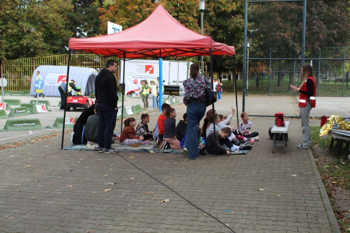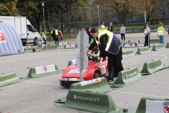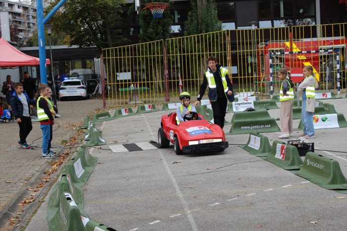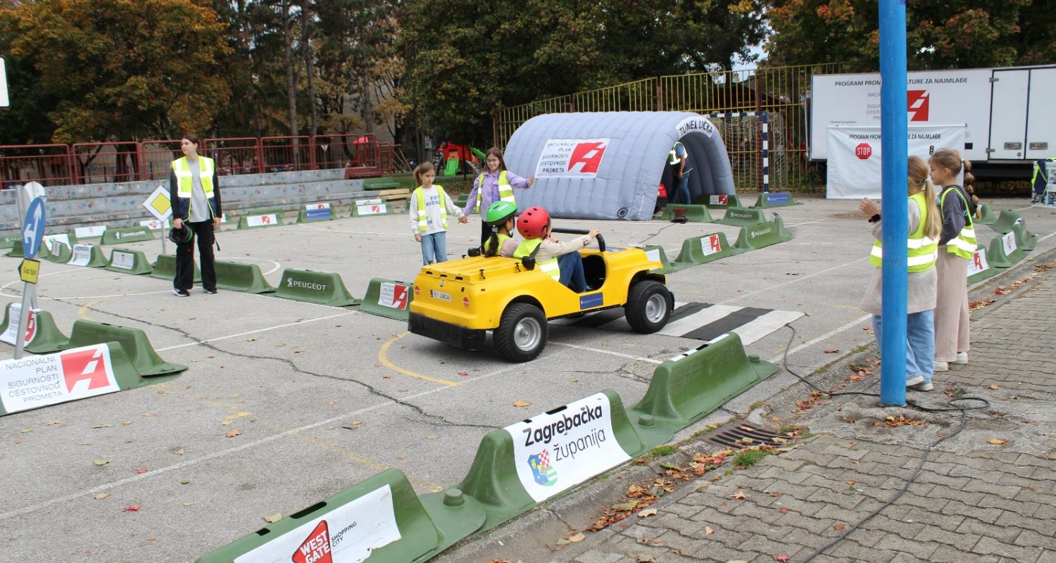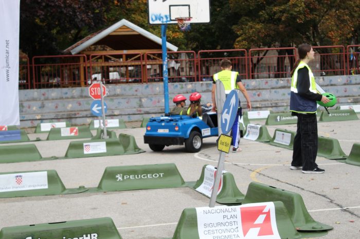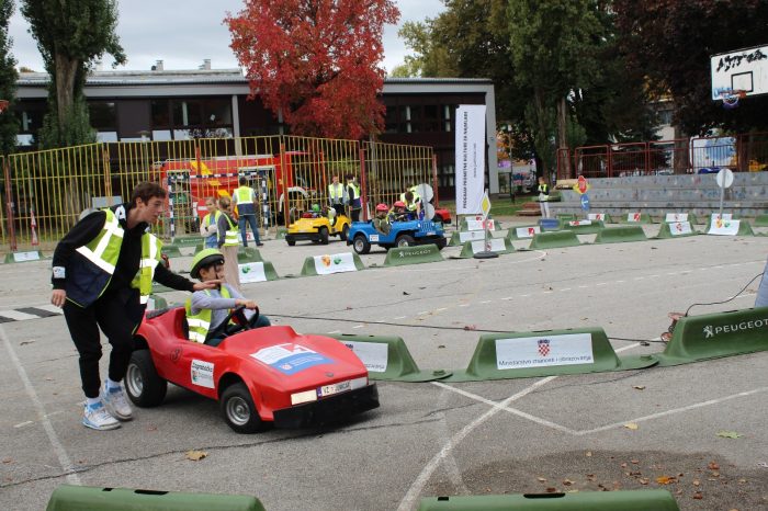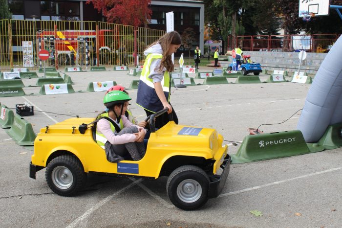 Nakon teorijskog dijela uslijedio je praktični dio koji je djeci i najzanimljiviji, gdje djeca pod budnim okom naših iskusnih instruktora u pravim mini električnim automobilima imaju priliku da stisnu gas i okušaju se u ulozi vozača, da dožive prometne znakove, semafore, pješačke prijelaze i sva ostala prometna obilježja, da na jedinstven način uče o sigurnosti u cestovnom prometu, a sve u cilju da postanu bolji pješaci. Polaznici programa dobro su se snašli na simuliranoj prometnici uz pomoć školske prometne jedinice Fran Š., Dominik H., Šimun M., ,Marta O. i David B. iz 8.a i 8.b razreda na čemu smo im zaista zahvalni. Kako je bilo upravljati s malim automobilima na simuliranim prometnicama znaju to i pojedine učiteljice koje nisu mogle odoljeti izazovu i skupa sa svojim razredom praktično primijeniti prometna znanja.