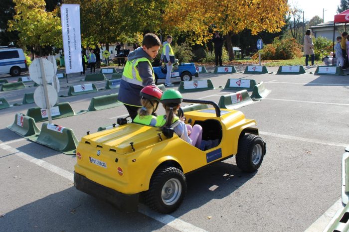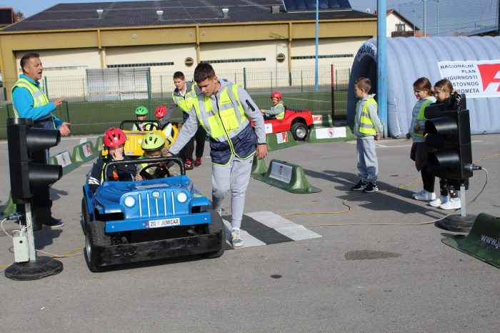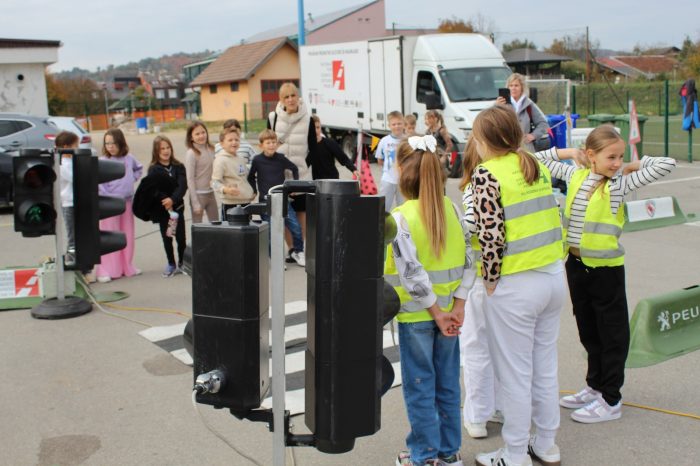 Nakon teorijskog dijela u trajanju od 45 minuta gdje su učenici kroz interaktivno predavanje učili o sigurnom ponašanju u cestovnom prometu djeca su izašla na školsko igralište gdje ih je dočekao veliki mobilni prometni poligon.