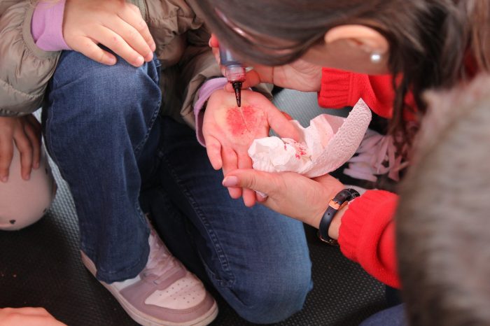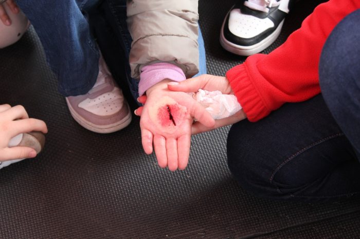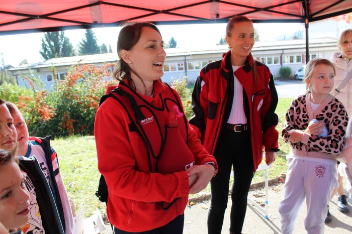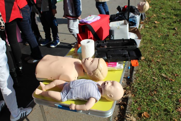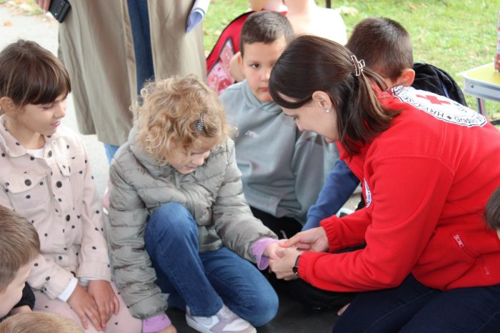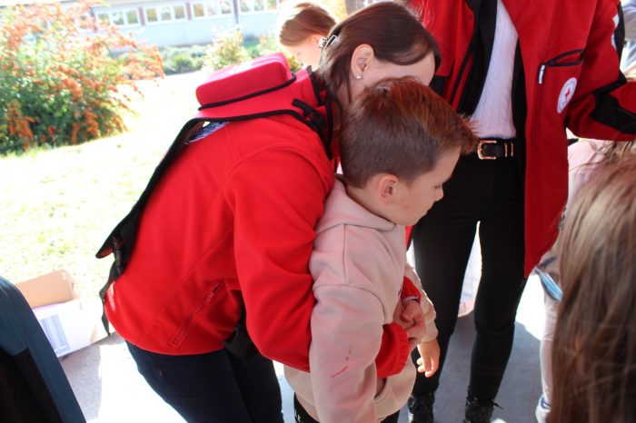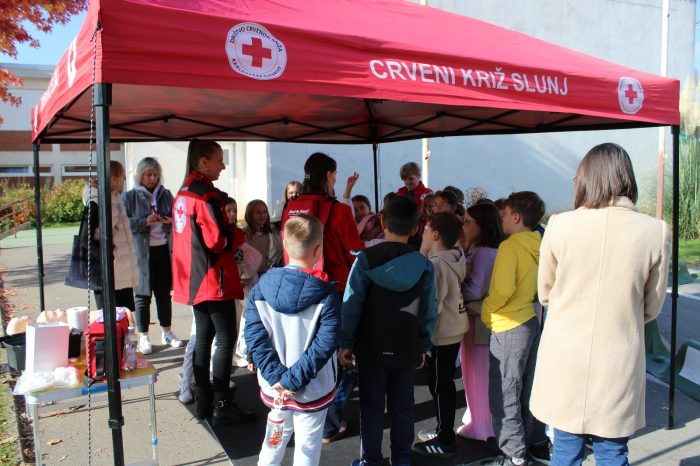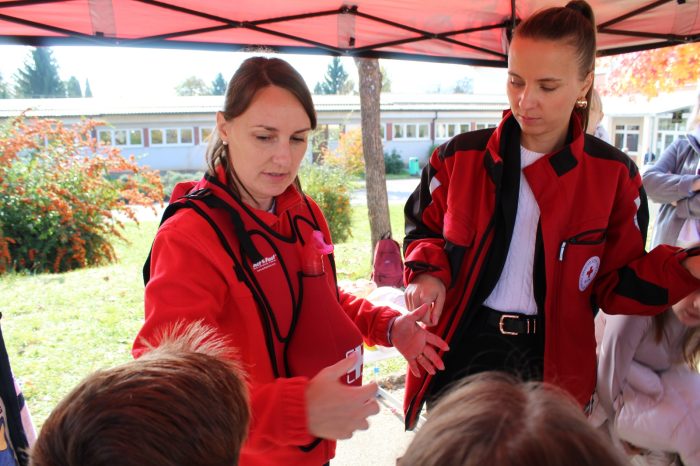 Članovi super crvenog tima bili su: gđa Dragica Holjevac i gđa Kata Piršić koje su posebno licencirane za pružanje ovakvog vida edukacija iz prve pomoći za naše najmlađe. Ukratko se ponavljaju brojevi hitnih službi nakon čega se učenicima postavlja pitanje o razlici između prve i hitne pomoći. Naglašava se važnost onih informacija koje je pri tom pozivu nužno reći (Što se dogodilo? Gdje se dogodilo? Kako se dogodilo?).. Nakon toga djeca imaju priliku naučiti kako postupiti kada su u pitanju lakše ozljede (ogrebotine, opekotine, giljotine) ili kako postupiti u nekim situacijama (krvarenje iz nosa). Kako pravilno pristupiti unesrećenoj osobi u slučaju zastoja srca. Velike pozdrave i zahvalu na organizaciji, podršci i prisutnosti.