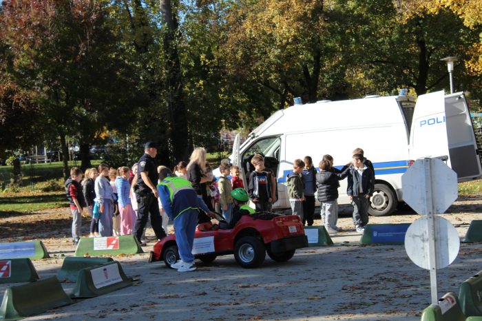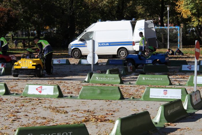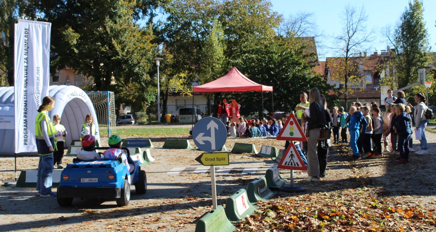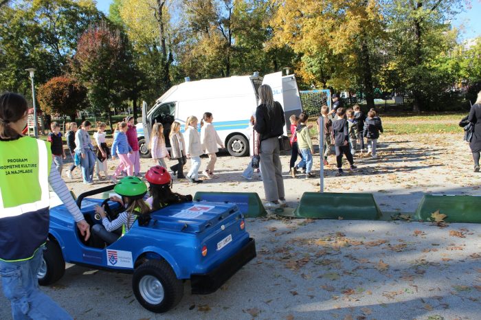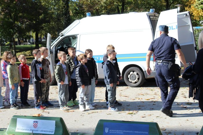 Nakon multimedijskog teorijskog dijela u trajanju od 45 minuta gdje su učenici kroz interaktivno predavanje učili o sigurnom ponašanju u cestovnom prometu, djeca su izašla na školsko igralište gdje ih je dočekao veliki mobilni prometni poligon.