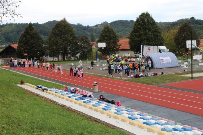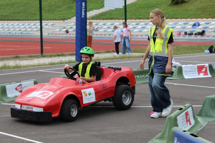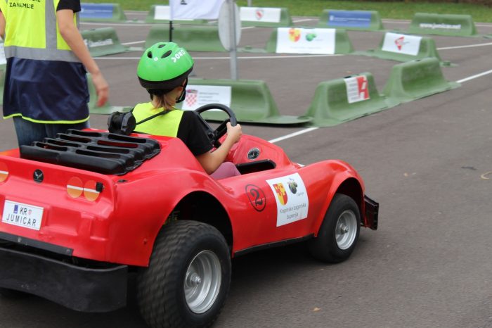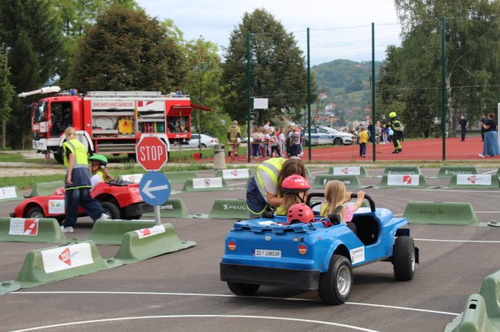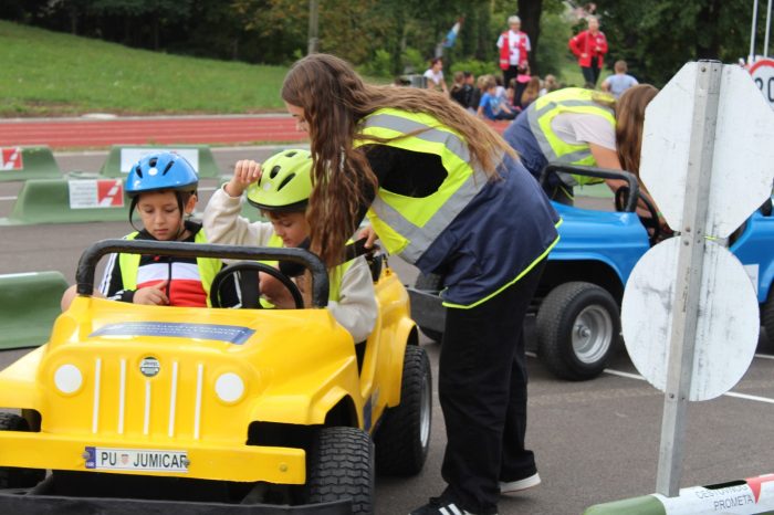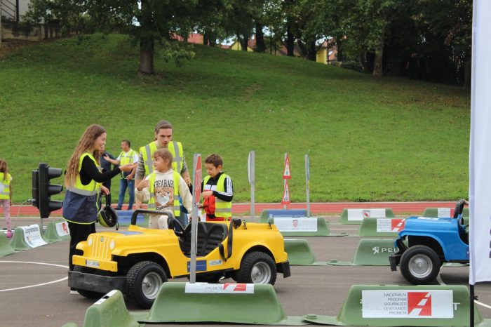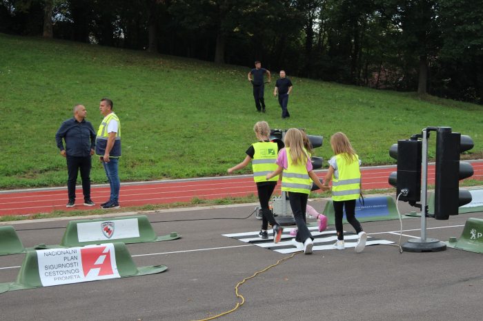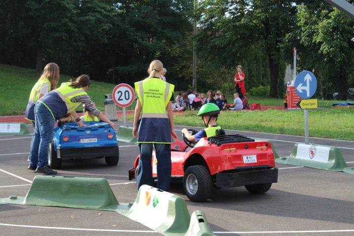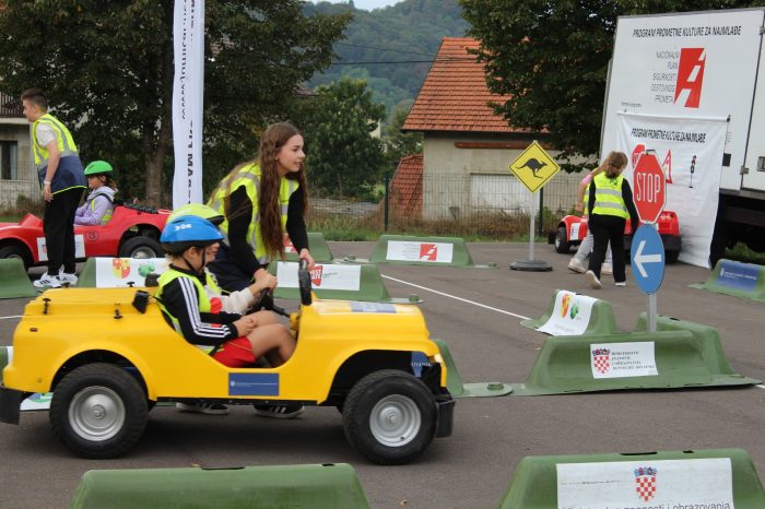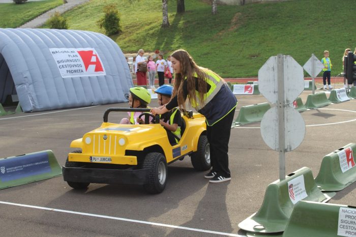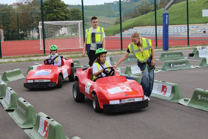 Nakon multimedijskog teorijskog dijela u trajanju od 45 minuta gdje su učenici kroz interaktivno predavanje učili o sigurnom ponašanju u cestovnom prometu, djeca su izašla na školsko igralište gdje ih je dočekao veliki mobilni prometni poligon. Na praktičnom dijelu programa pod budnim okom naših iskusnih instruktora u pravim mini električnim – automobilima imali su priliku da stisnu gas i okušaju se u ulozi vozača, dožive prometne znakove, semafore, pješačke prijelaze i sva ostala prometna obilježja tj. da na jedinstven način uče o sigurnosti u prometu. Mališani su vožnju odradili za čistu peticu, stoga im šaljemo zaslužene diplomice. Polaznici programa dobro su se snašli na simuliranoj prometnici na kojoj su promet regulirali iskusni instruktori uz pomoć školske prometne jedinice na čemu smo im zaista zahvalni, a to su učenici Iva, Tin, Magdalena i Dora iz 8.a razreda.